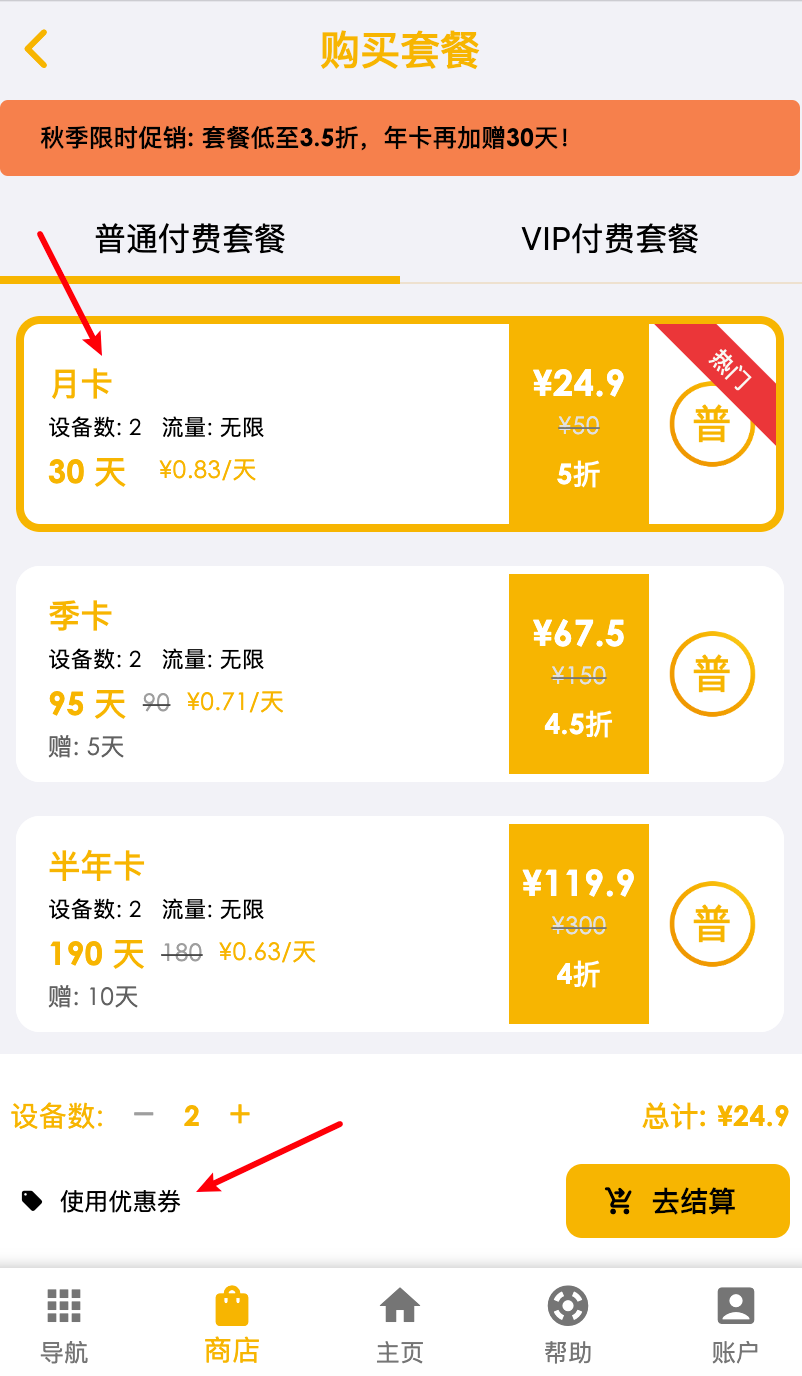 首先选择好您要兑换的套餐类型,比如:月卡。然后在页面左下角点击 “使用优惠券”,输入您的优惠码并确认即可享受折扣。